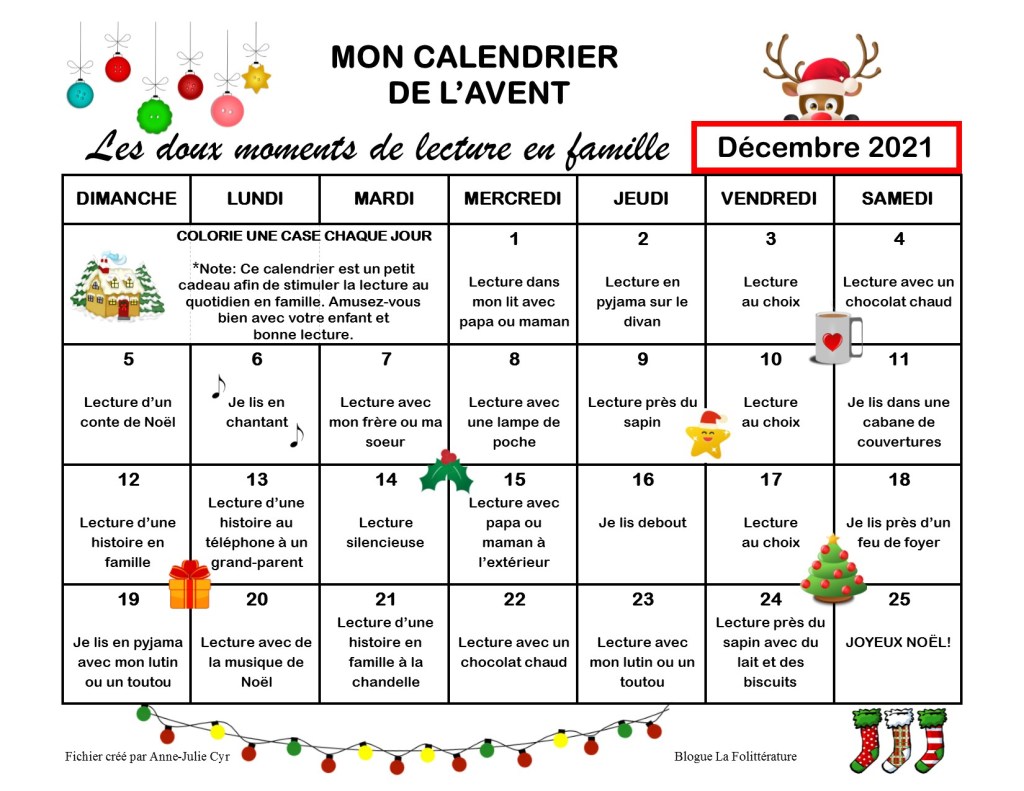 Cette année, puisque mes deux enfants vont à l’école primaire, j’ai voulu créer un calendrier de l’Avent pour stimuler la lecture au quotidien en famille. J’ai offert à leurs enseignants une copie, et ceux-ci, au choix, peuvent l’utiliser en classe ou l’offrir aux famille de leurs élèves. Puis je me suis dit, pourquoi ne pas le partager avec VOUS!