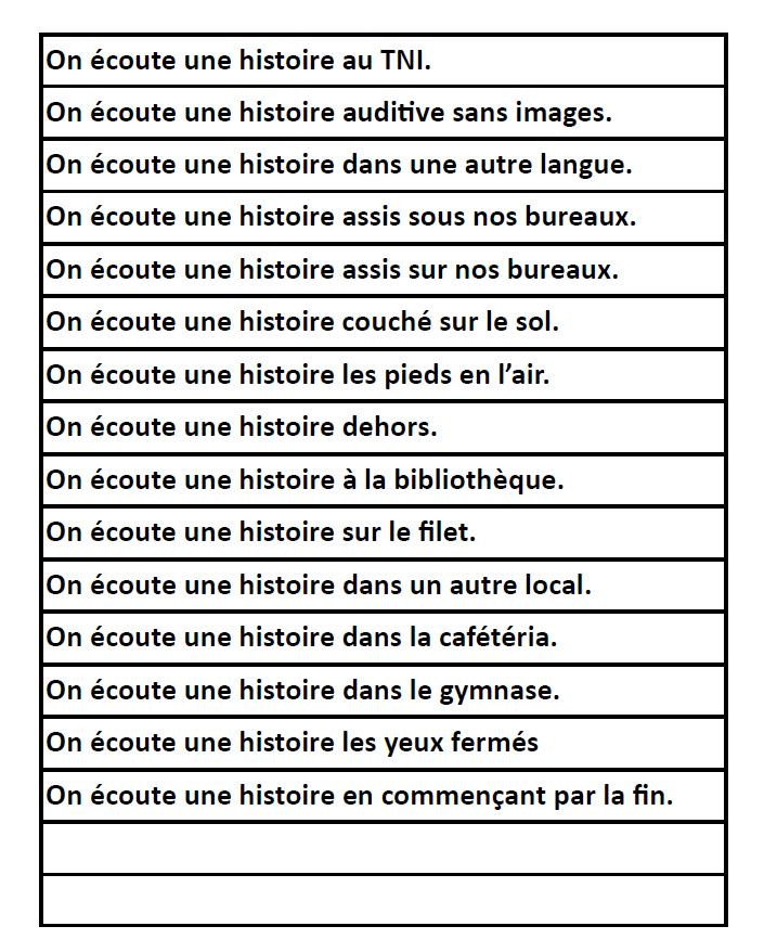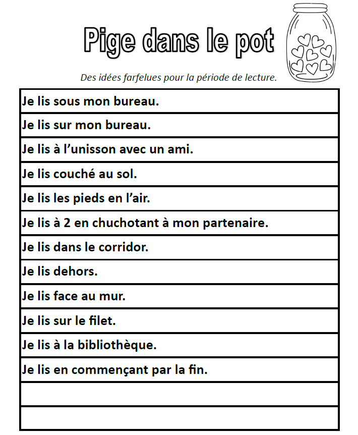 Cette activité propose différentes idées farfelues pour lire seul durant la période de lecture ou pour écouter une histoire racontée par l’enseignant.