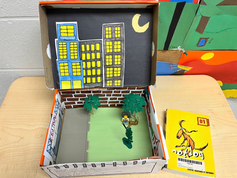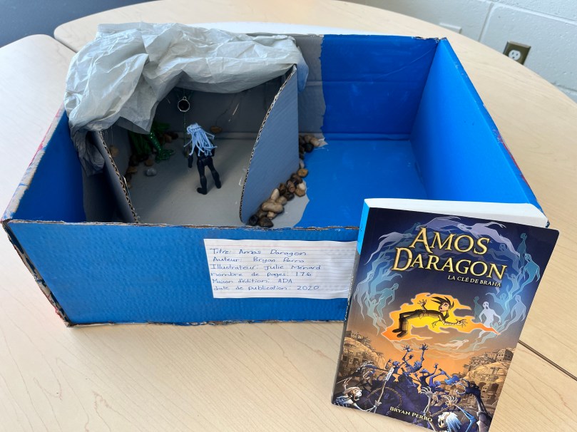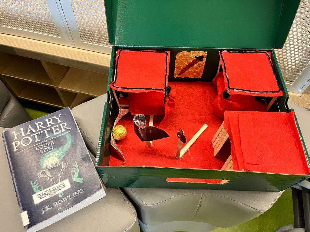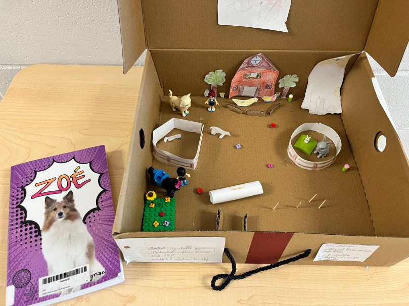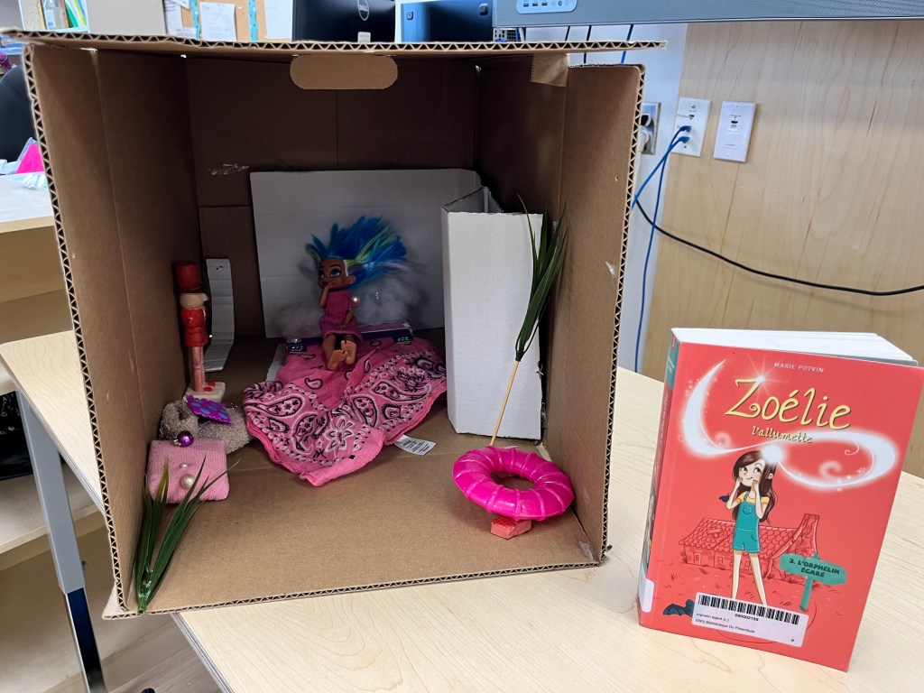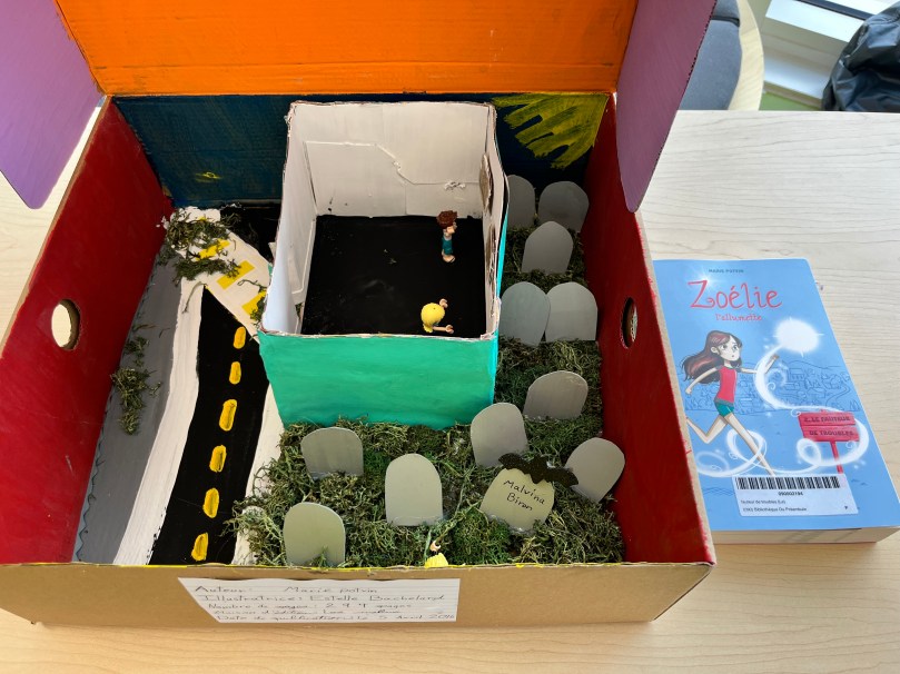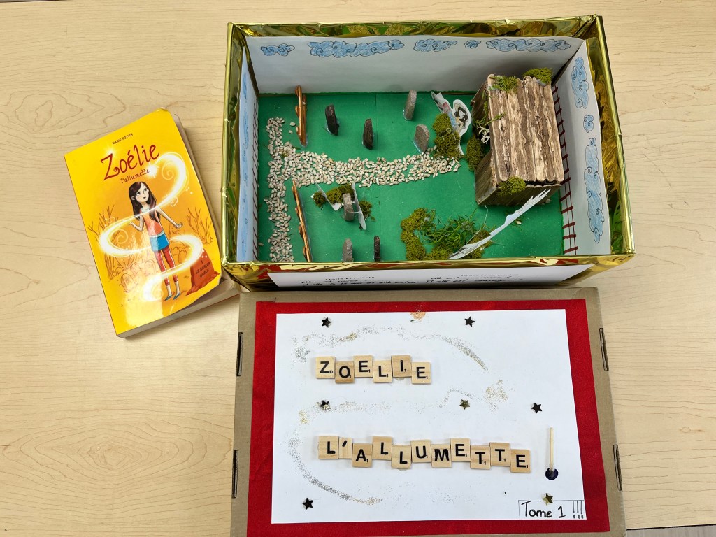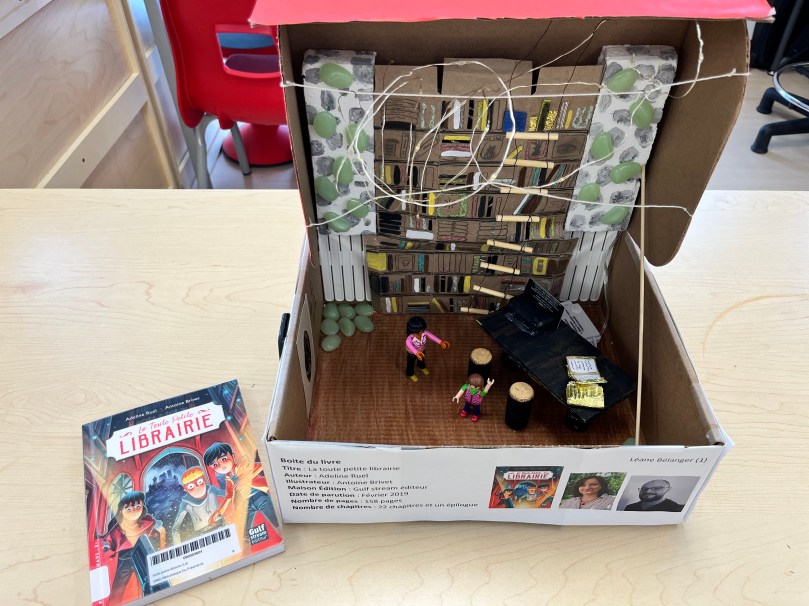 L’activité de la boîte aux livres, c’est une aventure qui débute par le choix d’un roman, avec peu d’illustrations, que l’élève désire lire. Après avoir lu l’ouvrage, l’élève doit représenter une scène de son livre à l’intérieur d’une boîte à chaussure avec le matériel qu’il désire et rendre compte de sa lecture autrement que par l’écrit. Auteur, titre, résumé ou extrait d’un passage du livre mis en scène, personnages principaux, tous les ingrédients d’une fiche de lecture réunis dans une seule et unique boîte. La boîte aux livres permet de présenter sa lecture d’une façon originale à ses collègues de classe et à son enseignante.