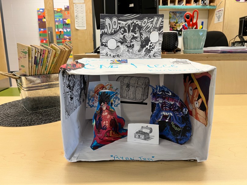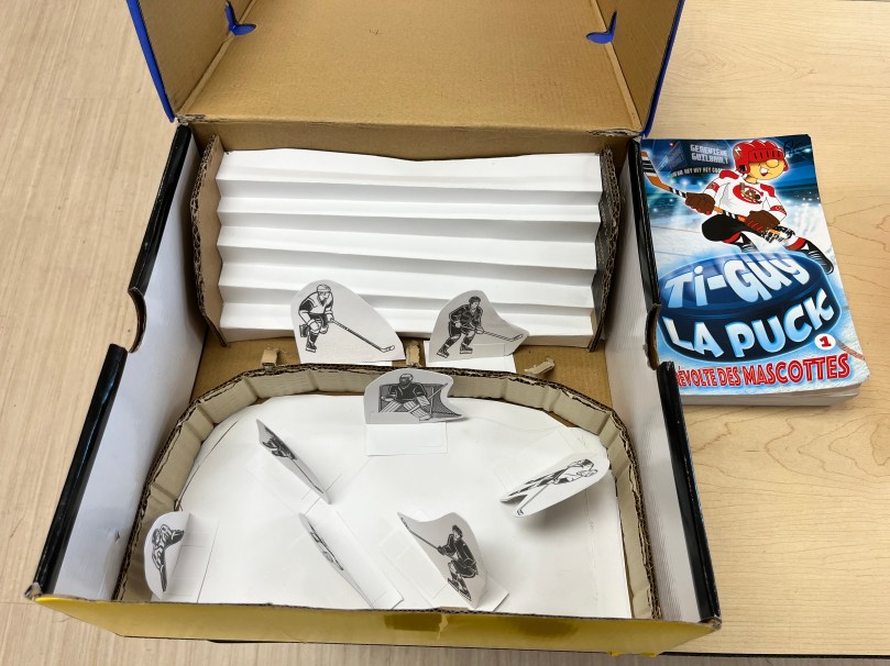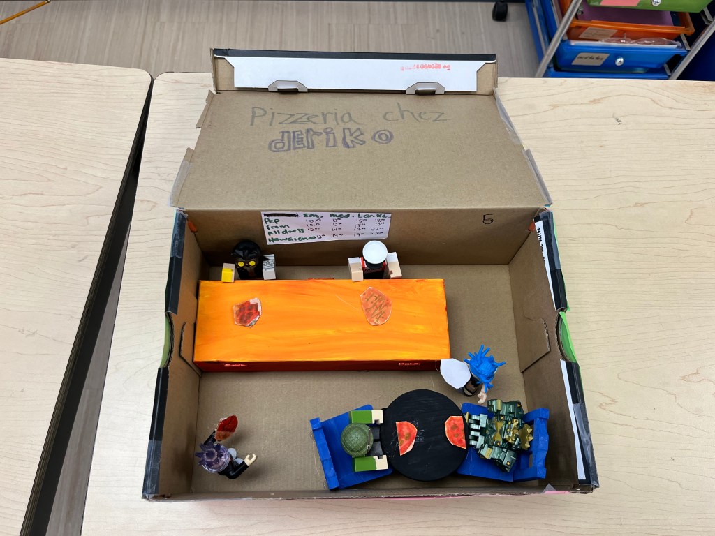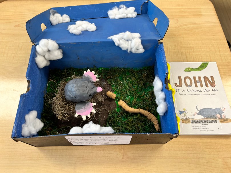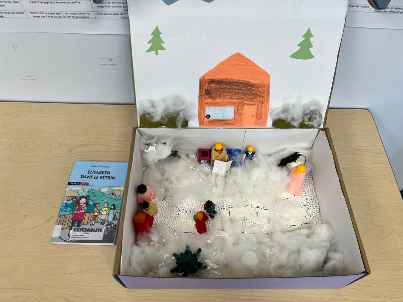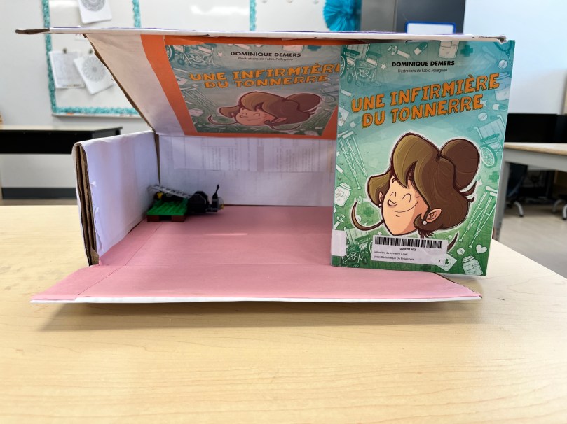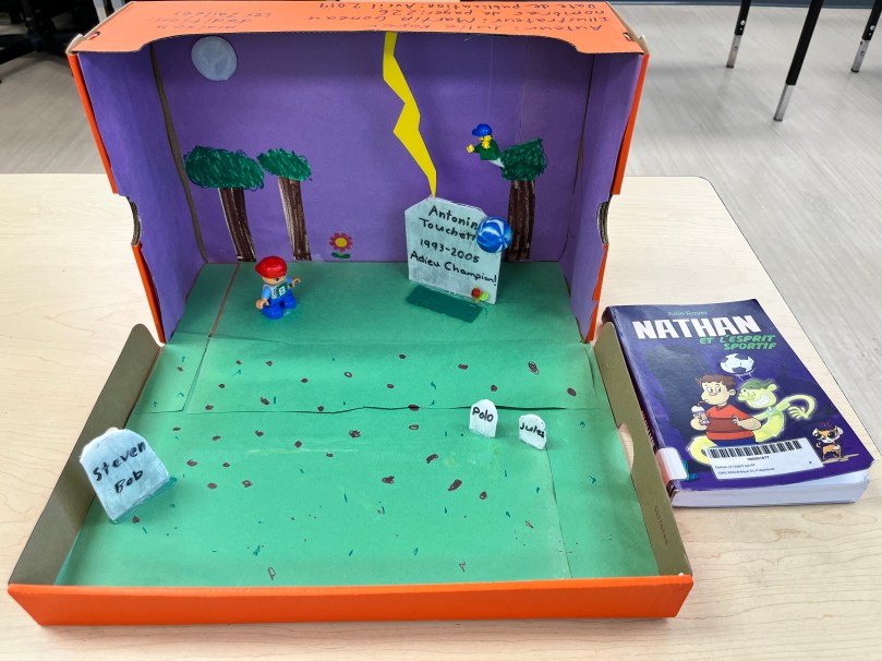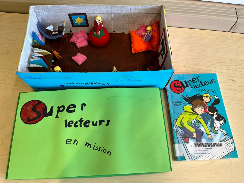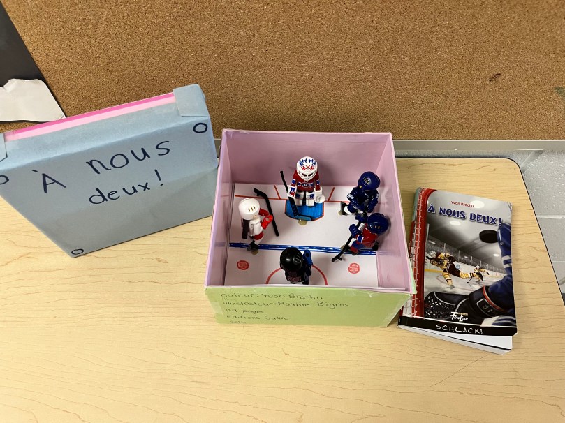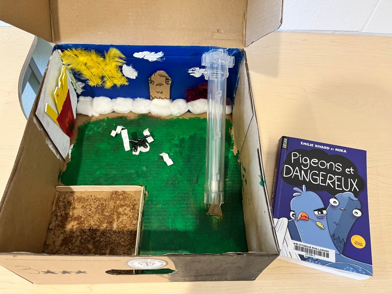 L’activité de la boîte aux livres, c’est une aventure qui débute par le choix d’un roman, avec peu d’illustrations, que l’élève désire lire. Après avoir lu l’ouvrage, l’élève doit représenter une scène de son livre à l’intérieur d’une boîte à chaussure avec le matériel qu’il désire et rendre compte de sa lecture autrement que par l’écrit. Auteur, titre, résumé ou extrait d’un passage du livre mis en scène, personnages principaux, tous les ingrédients d’une fiche de lecture réunis dans une seule et unique boîte. La boîte aux livres permet de présenter sa lecture d’une façon originale à ses collègues de classe et à son enseignante.